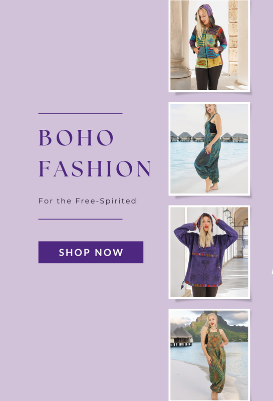 All of our boho hoodies, jackets, pants, and more are all handmade by artisan women in Nepal. Our stonewash color process gives each piece of clothing its own unique color, making it truly one-of-a-kind. Most of our styles are unisex by design, so no matter if you're looking for a bohemian-inspired top or trouser, we have something for you!